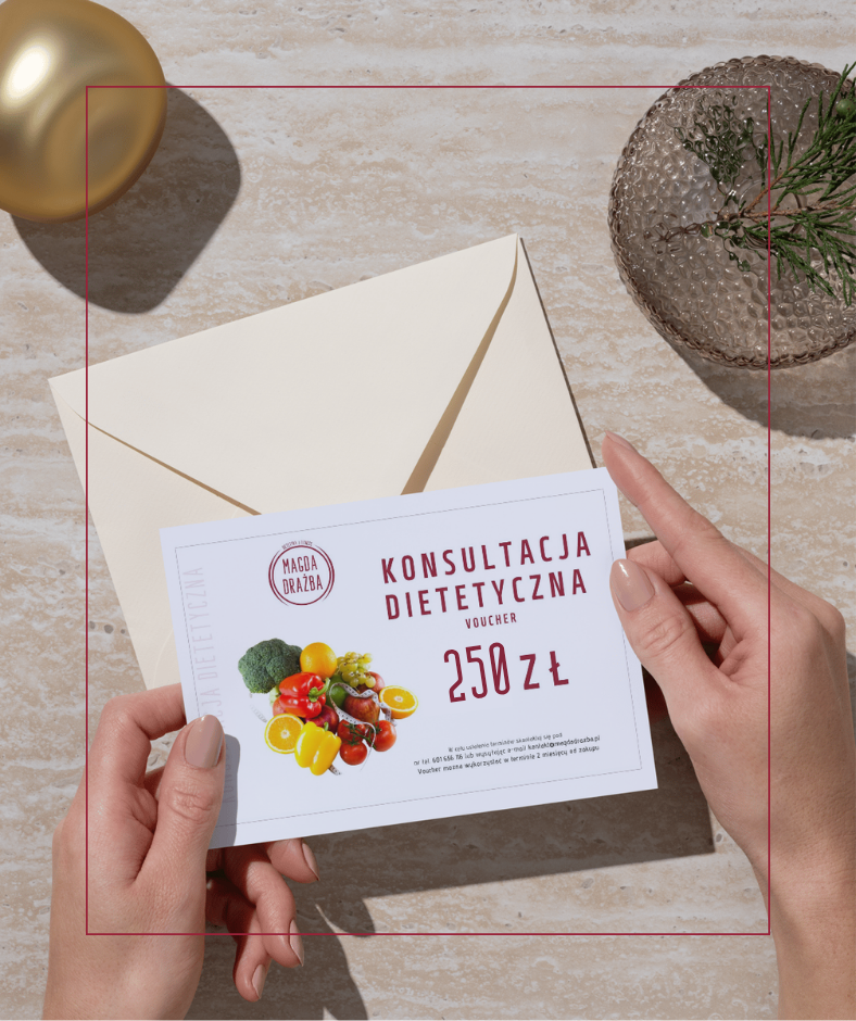Voucher dietetyczny o wartości 200 zł do wykorzystania na wizytę dietetyczną w ustalonym wcześniej terminie.
